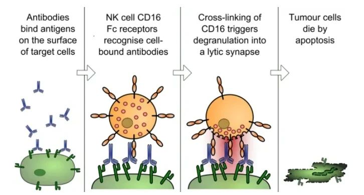 2、之后自然杀伤细胞(NK细胞)借助其表面相应的受体与结合在靶细胞上的IgG Fc段结合;