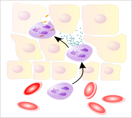 骨髓释放中性粒细胞受到严格调控:趋化因子控制中性粒细胞进入循环。中性粒细胞的趋化因子有两类:一是自身组织损伤释放的因子,例如胶原和纤维蛋白片段、补体活化产物及免疫细胞因子等;另一是微生物来源的含有N-早酰蛋氨酸残基的多肽。受趋化因子作用后,中性粒细胞表面的L-选择素(selectin)数量增加,血管内皮细胞开始表达P-或E-选择素;中性粒细胞迅速表达整合素(intergrin),例如MAC-1和LFA-1等,与内皮细胞的配体结合可使中性粒细胞变扁,紧密粘贴内皮细胞;继而中性粒细胞变形移出血管外,以阿米巴运动的方式向趋化源移动。这种过程多发生在毛细血管微静脉血流缓慢处。