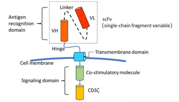 CAR分子是模块化合成,由胞外抗原结合域、铰链区、跨膜结构域、胞内信号结构域。其中胞外的抗原结合域单链可变片段scFv由可变域VH、VL和连接子linker组成,其赋予CAR细胞针对特定抗原的识别能力。