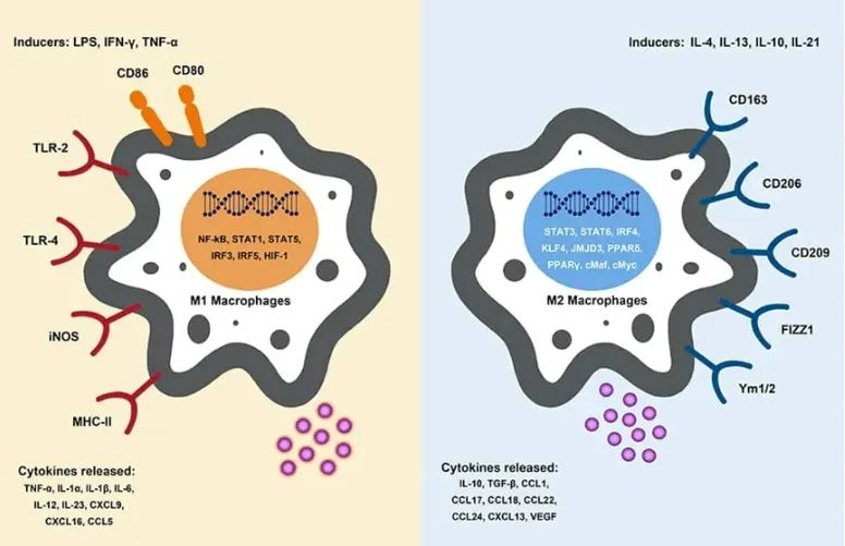 炎症,作为先天免疫的代表,其失控会致病,如重症哮喘、慢性阻塞性肺病、类风湿关节炎、动脉粥样硬化、非酒精性脂肪肝炎、甚至恶性肿瘤。造成以上疾病很大原因是巨噬细胞极化的失调。巨噬细胞是显著的可塑性细胞,可被不同局部细胞因子环境诱发极化。具有不同功能的两大巨噬细胞亚群包括经典激活或炎症(M1)和交替激活或抗炎(M2)巨噬细胞。
