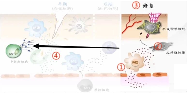 ②分泌细胞因子修复组织恢复成未发炎之前的状态,如促进成纤维细胞分化成肌成纤维细胞(分泌大量的胶原蛋白修补伤口形成疤痕)。