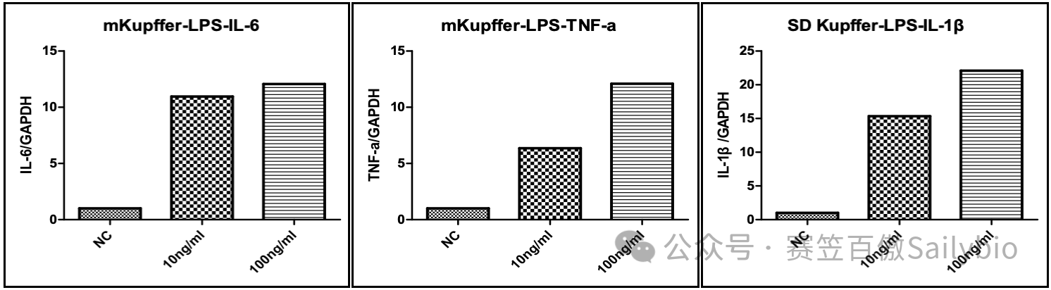 大/小鼠Kupffer细胞在不同浓度LPS刺激后,IL-6和TNF-α分泌呈剂量依赖型明显升高。